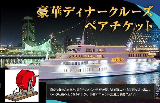 な・なんと! 豪華ディナークルーズペアチケット♪ 松坂牛♪ ずわいがに♪ ゴディバチョコレートケーキ♪ などご用意いたしました!